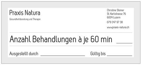 Sind Sie auf der Suche nach einem passenden Geschenk? Gerne stelle ich Ihnen Gutscheine für Sitzungen in meiner Praxis aus. Diese sind jeweils 1 Jahr gültig.